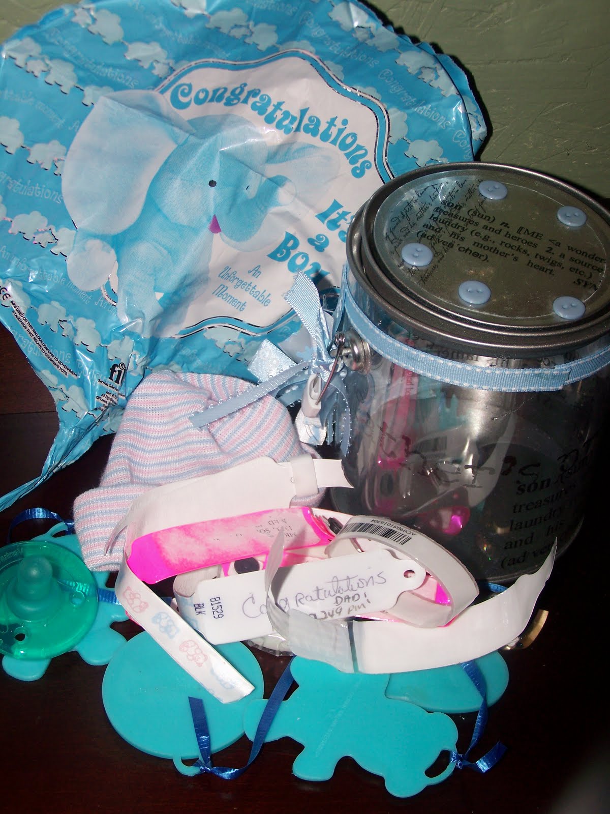 I bought these cans at a scrapbook store and decorated them with my favorite scrapbook embelishments. I made sure to leave a lot of the outside uncluttered so you could see the contents. It's a great place to store those teeny tiny newborn diaper, hospital issue pacifier and cap, deflated balloons, sonogram pics, id bracelets and such. I love how handy they are, my only regret is that I didn't purchase the larger cans, there's just so much I wanted to hang on to.